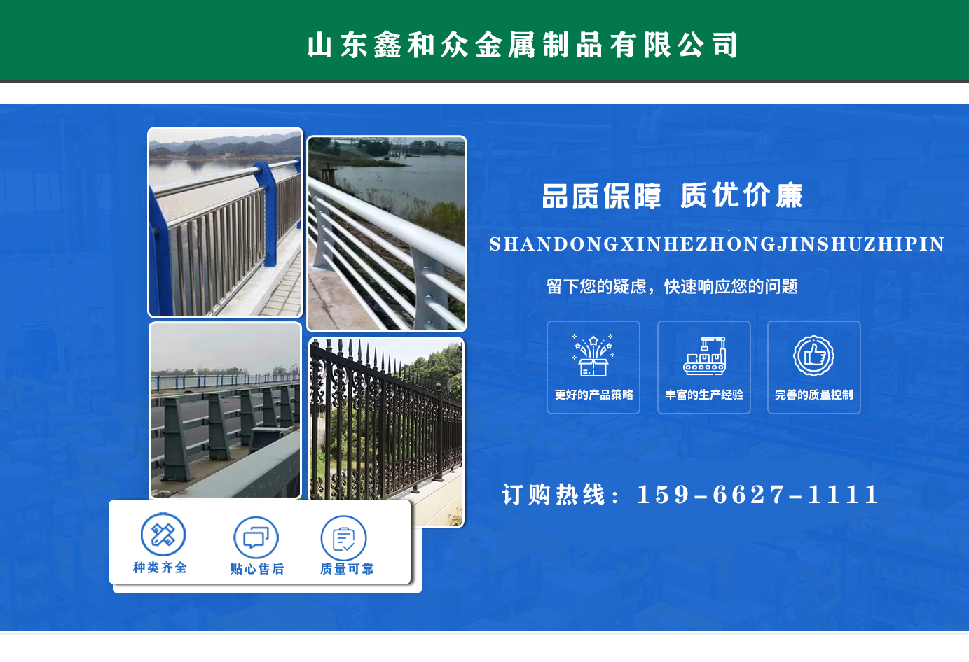 山東鑫和眾金屬制品有限公司主要產(chǎn)品有防撞護(hù)欄,橋梁護(hù)欄,道路護(hù)欄,河道護(hù)欄,不銹鋼護(hù)欄等護(hù)欄。提供設(shè)計(jì)方案,一站式定制,包您滿意價(jià)格優(yōu)惠,歡迎來電咨詢! 公司常年從事銷售護(hù)欄防撞護(hù)欄,橋梁護(hù)欄,道路護(hù)欄,河道護(hù)欄,不銹鋼護(hù)欄,橋梁鋼護(hù)欄,河道燈光護(hù)欄等。產(chǎn)品廣泛應(yīng)用于橋梁、河道、旅游景區(qū)、道路、公路、公園、小區(qū)、景觀、道路防撞等領(lǐng)域。 公司產(chǎn)品均采用優(yōu)質(zhì)不銹鋼材料,符合相關(guān)標(biāo)準(zhǔn)。各種型號(hào)不銹鋼復(fù)合管及護(hù)欄,質(zhì)量嚴(yán)格把控。產(chǎn)品強(qiáng)度高、耐腐蝕、焊接牢固、抗沖擊、性能好,防撞護(hù)欄結(jié)構(gòu)簡(jiǎn)單、美觀實(shí)用大方。 歡迎前來訂購!...